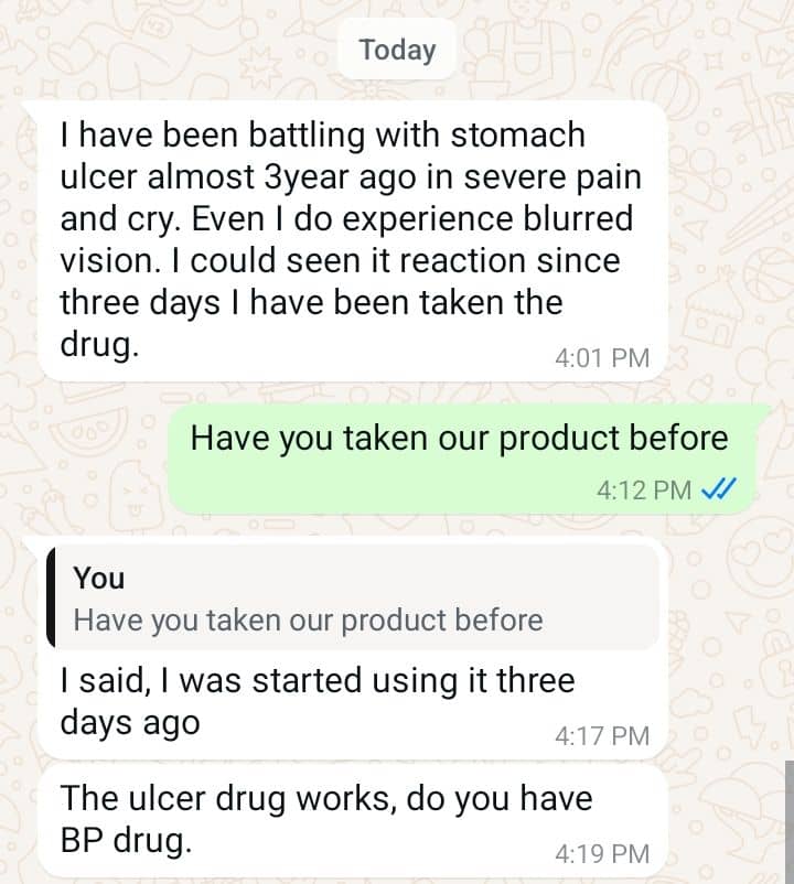 “Please, doctor, I’ve really suffered a lot, and I’m losing it. I’d really appreciate it if you could give me something to cure these things once and for all. No matter the amount, I’ll try to raise it and pay, just to get healed from Ulcer permanently.” – I told the doctor.
